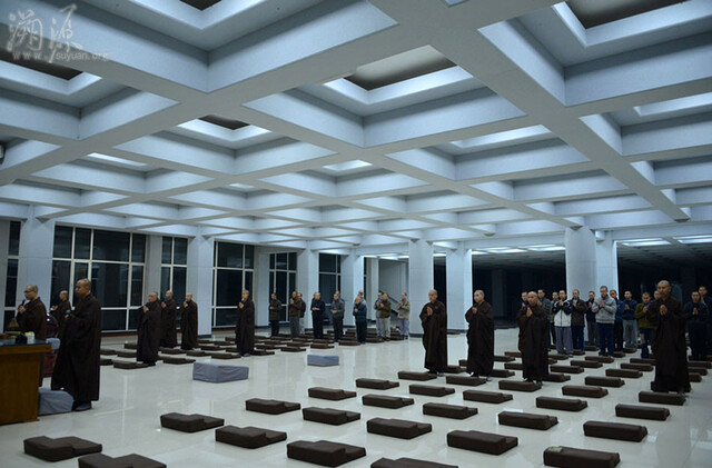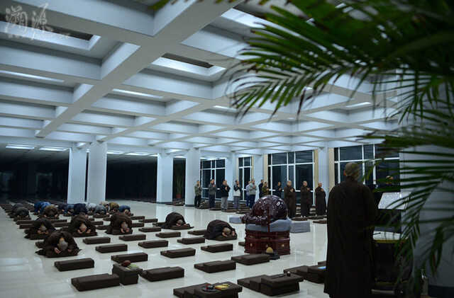 5/40剃度前,發心出家居士須通宵拜懺。僧眾領懺,寺內其他男眾居士隨懺。(圖片來源:溯源佛教網)