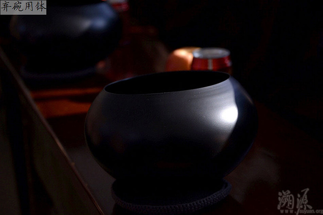39/40佛制戒律,僧人飲食需用沙門 的標誌——缽。缽(梵patra)比丘六物(三衣、缽、坐具、漉水囊)之一。又稱缽多羅、波多羅、缽和蘭等。意譯應器、應量器。即指比丘所用的食具。 其種類有鐵缽、瓦缽之別。持缽行乞稱為「托缽」。一缽之量剛夠一僧食用,僧人只被允許攜帶三衣一缽,此缽則為向人乞食之用,是僧侶不可離身之物。(圖片來 源:溯源佛教網)