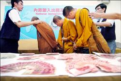 慎防假和尚、假尼姑、藏傳假活佛、假仁波切、附佛外道眾多詐騙犯,近幾十年大陸寺廟被不肖商人大量承包,充滿假寺假僧,世界各國都知,光河南有一村就有數萬多名假和尚四處假冒少林寺武僧人之名,以少林寺之名賣假藥詐騙,甚至還有假尼姑、附佛外道的及藏教假活佛、假仁波切、遠至國外行騙,但尚不至如國外基督教士強姦兒童,玩弄女人,這類人物很多,可能已近百萬 圖:台灣移民署昨日破獲中國跨國詐騙集團在台喬裝和尚斂財案,詐騙集團成員來台期間每天穿著袈裟,在台北大街小巷以建大陸觀音寺為名,沿路向民眾募款。(記者羅沛德攝) |