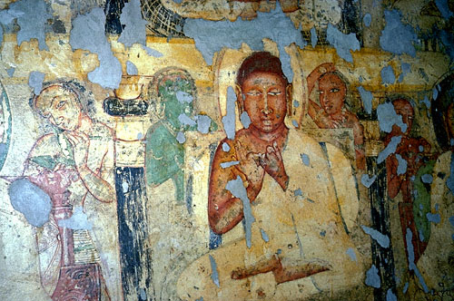 另外,周壁上的鹿王本生、摩耶夫人之夢等佛教故事,情節曲折,內容更為廣泛。在第16窟內左邊牆上的壁畫,是喬達摩出家修道時他妻子的悲哀畫面,喬達摩出家修道後,妻子耶輸陀羅斜坐在椅子上,微微低頭,憂傷欲絕、痛不欲生的神情活現於畫面。在16窟的外面,有一條小路,是在岩石上鑿成的,從石階下去有一門,門外兩旁各有一隻用黑石雕成的大象守門,再往前就是巴哥拉河岸。據說,唐朝玄奘法師在公元638年曾航行到此登岸,訪問阿旃陀石窟。在第17窟裡的佛在兜率天宮說法一畫,生動地描繪了眾多善男信女騎馬、乘車從各個地方趕來,集中精力聽講的情景。畫中人物表情各異,不同的坐騎也表現得生動逼真。阿旃陀石窟集印度古代建築、雕刻和繪畫之大成,融三者於一體。它雖然取材於佛的生平事跡,但卻如實地反映了當時印度古代宮廷生活和社會風貌。壁畫和雕刻的優秀藝術,不僅對後來印度的美術產生了巨大作用,而且對東方佛教所曾傳佈的國家和地區也產生了深遠影響。