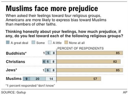 在民調查中,半數以上的美國人說他們並未對穆斯林存有偏見。 然而,百分之四十三承認至少對穆斯林存有“一點點”的偏見,這顯然高對其他三種信仰存偏見的比例