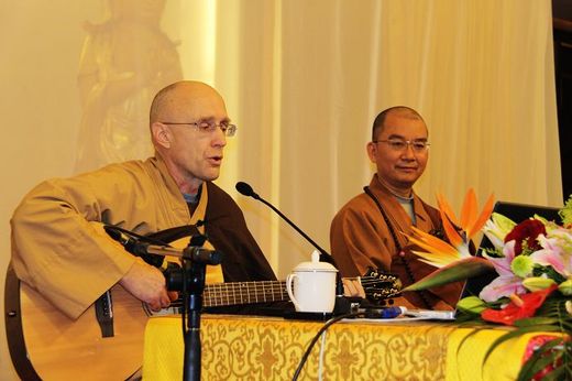 談到他的音樂,法師如數家珍地講述各種音樂流派的前世今生,似乎在普及音樂史知識。在進行一番探索後,他毅然放棄了傳統佛教音樂,改用美國鄉村民謠作為弘法音樂,在唱詞上也把傳統的經文唱誦換成了自己創作的佛經故事。一首歌往往是一個簡單的小故事,伴著木吉他的輕輕彈奏,聽眾往往能在沉醉之餘發出生命之幽思。他還說起約翰·丹佛(John Denver)和他的《鄉村路帶我回家》(Take Me Home, Country Road),在他的弘法音樂專輯中處處流露出斯人的風韻。2009年11月6日,北京大學秋林講堂,法師用心愛的木吉他,以酷似約翰·丹佛的嗓音現場彈唱了一首讚頌觀世音菩薩的歌曲《她度我》(She Carry Me),震撼全場。我問法師,會不會把自己定位為一個僧人中的藝人,法師搖搖頭,說音樂只是他用來弘法的手段。