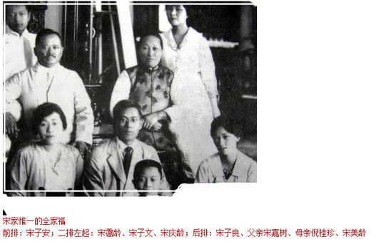 前排:宋子安;二排左起:宋靄齡、宋子文、宋慶齡;後排:宋子良、父親宋嘉樹、母親倪桂珍、宋美齡