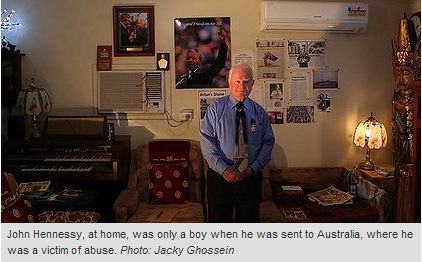 1946年,他才10歲由英國政府以孤兒之名被送往澳大利亞西部荒涼的Bindoon教區,他記得有人承諾到 Fremantle村時,會有一個大冒險,袋鼠會帶孩子們去上學,橙子會從樹上掉下,但他們是被趕進卡車內