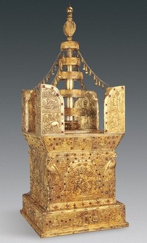 The parietal bone of the Buddha was buried within an inner casket made of gold, which, in turn, was placed in an outer casket made of silver, according to the archaeologists. The silver casket was then placed inside the model of the stupa.