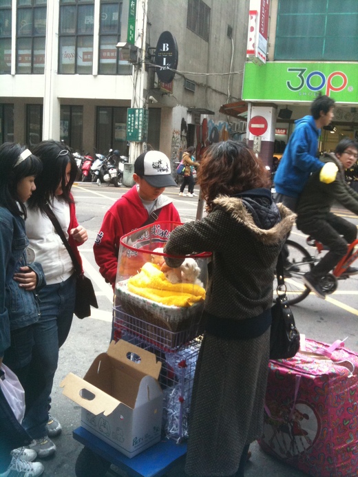 下圖:「貓女」的賣小狗攤位。不時有路過的客人在撫摸、玩弄可愛的小狗。