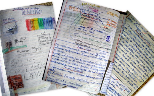 幾個禮拜前,兒子唸的小學放寒假,老師叫小朋友們把學校的幾個科目的上課時作的作業本子拿回家給家長看。我在翻閱的時候發現一本貼著標籤”HSIE / Science”(Human Society and Its Environment / Science)「人類社會及其環境」和「科學」兩科合在一本的課堂作業簿裡,兒子在小五課堂上寫的有關「民主」(Democracy)的作業及討論的摘要。我很好奇澳洲的小學是如何教小朋友「民主」這一課的,便一邊讀、一邊假裝不懂向兒子討教。其實,我是很好奇澳洲的小學老師是怎麼跟這些十歲左右的小學生解釋「民主」、「人權」這些連成人都不見得關心或模糊的概念。同時,我也想瞭解兒子到底懂多少,是像鸚鵡一樣重覆老師的說法?還是有自己的想法?