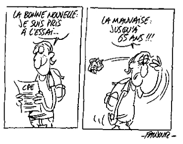 圖:好消息:我拿到一個試用機會…壞消息:試用直到65歲(法文)。(引用http://www.wretch.cc/blog/francais&article_id=3111877)