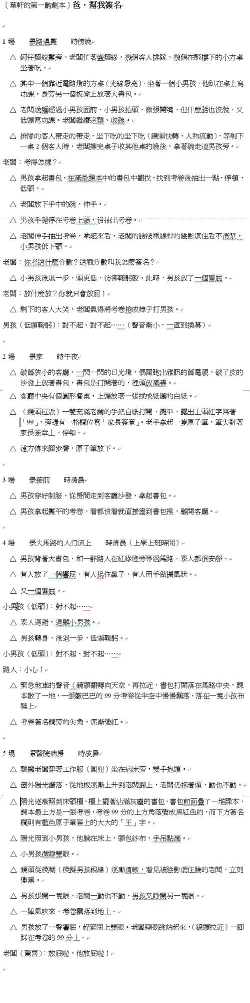 聽了老師的建議後,想再加2、4場景。但能加什麼呢?想來想去,只好增加一點劇情,就是「簽名」的劇情,最後劇本也多了2、3景(因為想不到在最後一場戲前該加什麼,加在手術房前的事情好像太累贅),最後,故事成了這樣,好像多了點韻味,真不虧是老師。