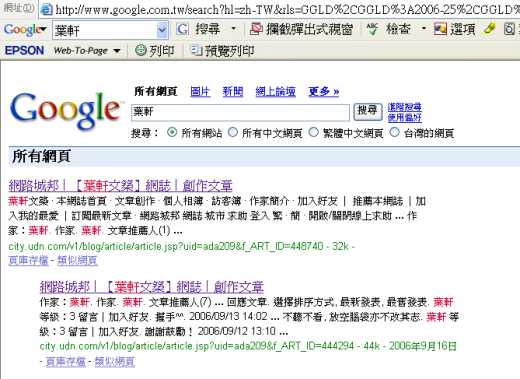 首先,以「葉軒」為關鍵字在google中搜尋時,我在城邦的部落格已經榮登第一筆,這在以前是想都沒想過的事情。