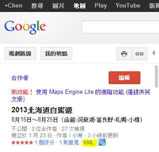 (1)Google→地圖→我的地點→地圖→(已經建立的地圖)找到下面的KML(如下圖黃色螢光筆標示部分)