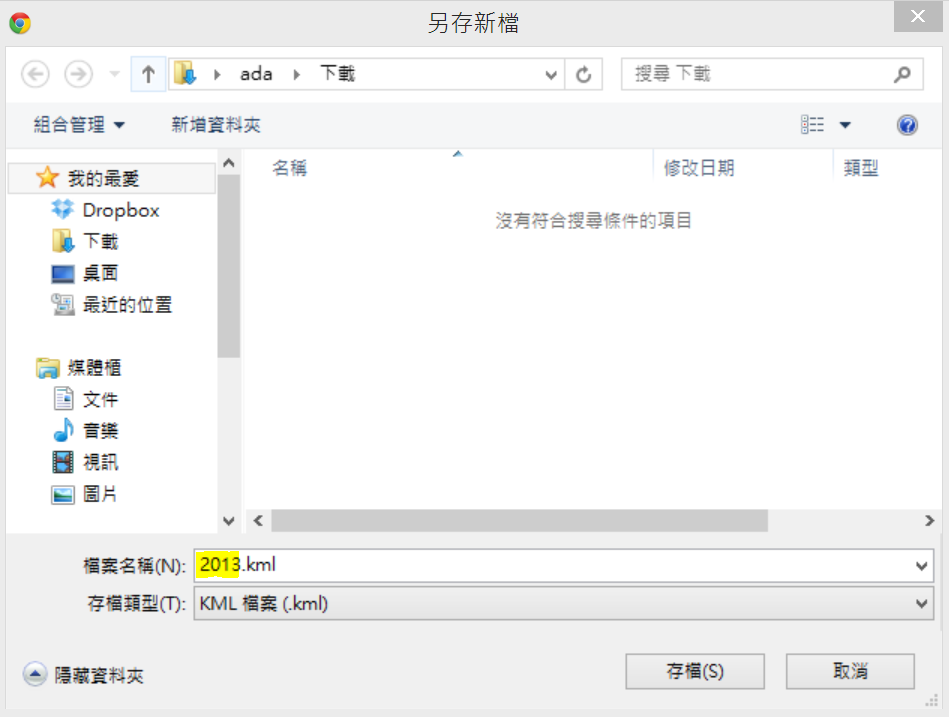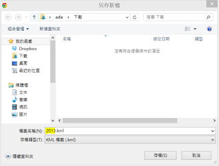 按下後會出現另存KML檔的視窗,請打上自己好記得的名字(在下圖黃色螢光筆標示部分),存在自己能找到的地方。