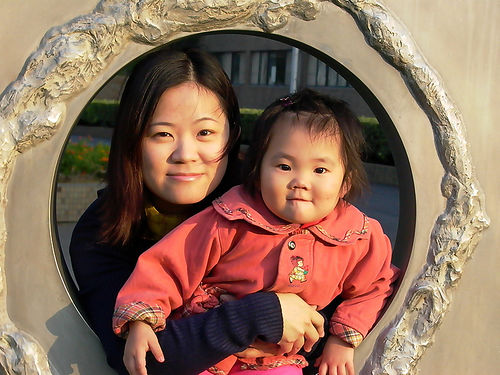 對面的街道上,一個中年婦女牽著女兒的手正準備過馬路。小女孩大約十歲,很活潑,逗著媽媽笑個不停。