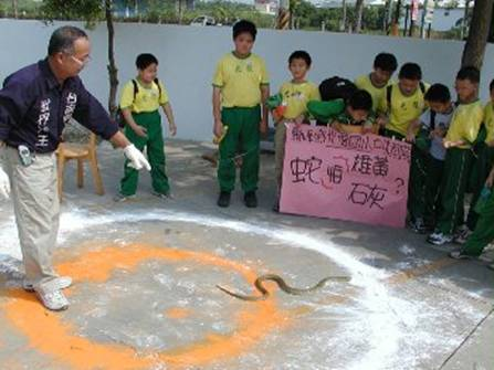 光復國小因常有蛇類出沒,商請黃國男為學童解說蛇類常識與防蛇之道,學校戶外教學也特別南下到世界蛇王教育農場舉行,黃國男在一一說明各種本土與外來種蛇類、爬蟲生態習性前,把一尾蛇放進用雄黃粉與石灰粉劃的圓圈內,周遭再以細魚網團團圍住,證明雄黃、石灰對蛇毫無影響,反而細魚網能困住蛇。