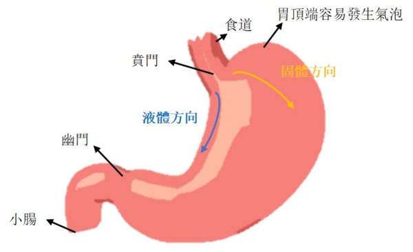 胃囊的左邊和右邊形狀不對稱可以讓液體和固體食物走不同的路徑,液體順著較短的一邊流下;固體則被拋到較長的一邊,走更長的路徑,剛好泡在胃酸的時間更久。