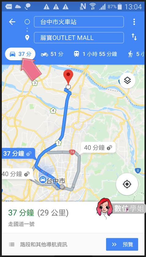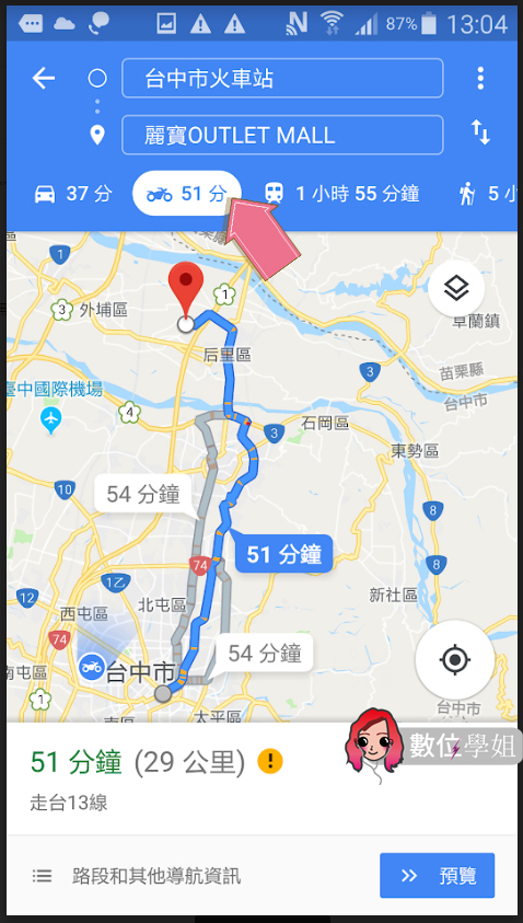 一樣在google map APP上輸入目的地,就可以切換是開車模式或是機車模式,