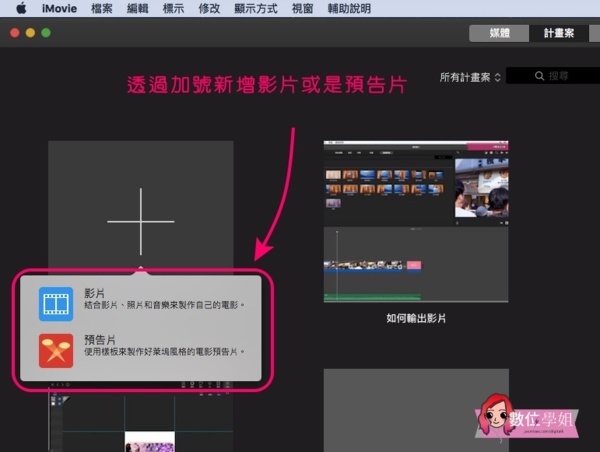 當你第一次打開iMovie時,可點選計畫案按鈕,透過加號新增影片或是預告片