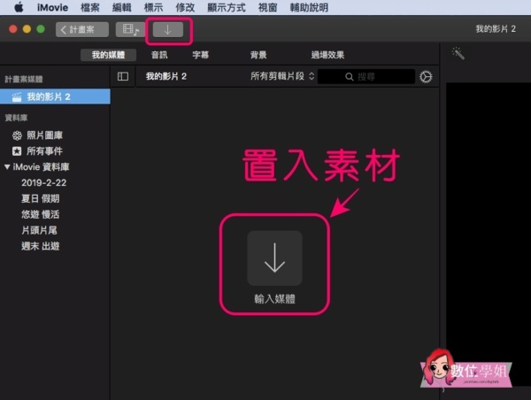 第二步驟置入素材:包含要剪輯的影片、照片、音訊