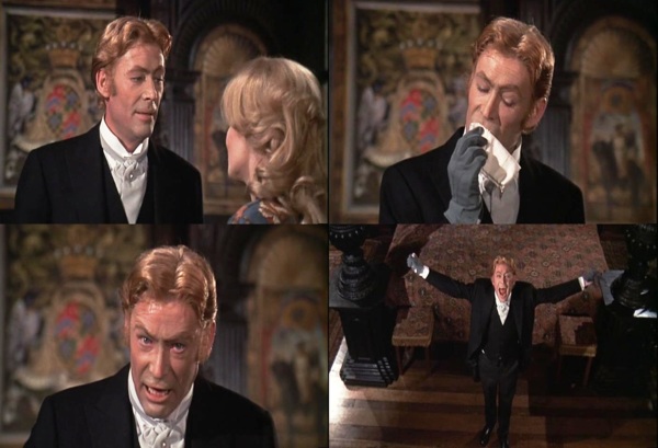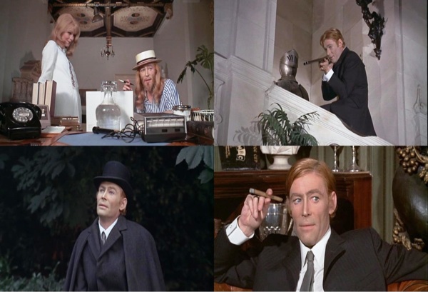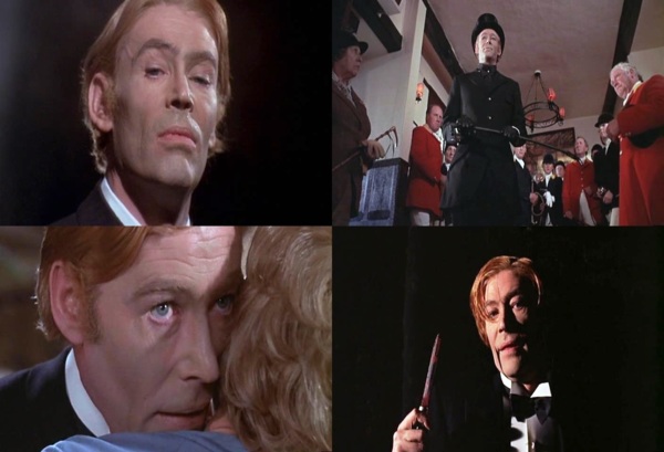 而這部「統治階級」(The Ruling Class,1972),乾脆演神經病,前段篤認上帝之子,成天瘋言瘋語,透過出神入化咬字魔力,特別幽默有趣,「(你怎麼知道你是上帝?)簡單,當我向祂禱告,我發現都在跟自己講話」(Simple. When I pray to Him, I find I am talking to myself.)、「我不在時,你們放鬆點,來點性愛」(enjoy yourselves while I‘m gone. Relex. Have sex.)、「我戴上眼鏡因為覺得冷」(I put on my glasses because I feel cold.),還有結婚前在十字架上大段宣言:「今天我要祝福所有的一切,祝福…W.C. Fields雖死猶生,..祝福不屑一顧的長頸鹿,..祝福女工程師協會,..祝福矮小的河馬,祝福強大的蟑螂,祝福我,今天是我結婚的日子」,連串鏗鏘祝禱,躍入塵世。