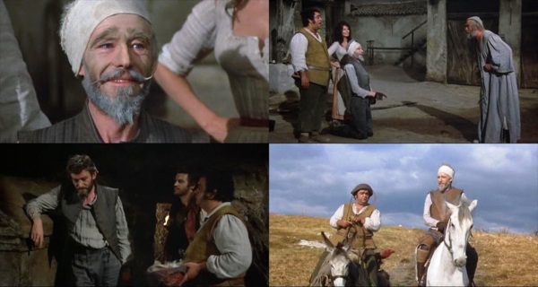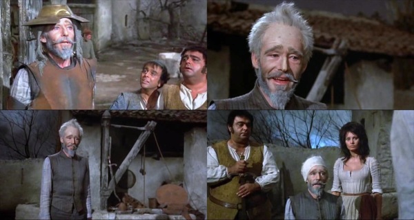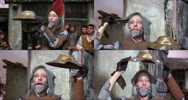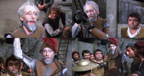 主僕分騎白馬、毛驢,一路隨想像前進,風車當巨人,一陣衝殺,摔落無妨;鄉間客棧當城堡進駐;見洗碗女工Aldonza(Sophia Loren),奉為女神Dulcinea;抹布當絲巾;理髮師鐵盆當鋼盔;客棧老闆(Harry Andrews)半夜被院內打鬥吵醒,莫名其妙升格堡主,無奈做戲封Don Quixote為騎士,但望眼前神經病一早離開。