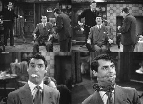 據說,Cary Grant覺得自己表現太誇張,甚至是最不滿意的作品。但其實他的誇張演出,活靈活現討人喜歡,各種表情變化、唸白語調、肢體動作,從頭至尾快速精準,尤其綁在椅上到脫困坐在樓梯抽菸喃喃自語一整段,能演到這樣乾淨俐落,又讓觀眾開心,實令人佩服,亦難出其右,這絕對是他數一數二重量級喜劇功力展現。