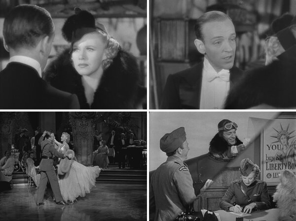 Fred Astaire雖沒有Ginger Rogers那麼多喜怒哀樂情緒表現,但其實沉穩有真情,無論受困巴黎或是投身戰場,都是報喜不報憂,深情安慰Ginger Rogers,優雅邀請她共舞。最好的一場就是跟軍人共同演出完畢,(這段也是Fred Astaire獨舞,舞步早於James Cagney(1899-1986)主演的「勝利之歌」(Yankee Doodle Dandy,1942)),Vernon簽署加入皇家飛行隊,國家有難他不能置身事外,他告訴美國籍妻子Irene,如果美國參戰,她也會有同樣感受,會懂他為何要入伍,他安慰她,戰爭說不定很快就結束,他很快會回來,跟她一起過日子,說著說著有點哽咽,滿動人的。