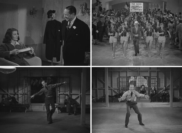 其實劇情就是從入伍後,開始亂七八糟,讓人不敢恭維, Fred Astaire角色個性前後不一致,前段看著專業嚴肅,入伍後變得糊塗幼稚,不是關警閉,就是偷溜出去找Rita Hayworth。以前他與Ginger Rogers(1911-1995)合演喜劇,看得機靈可愛,來到這部,同樣死纏爛打,卻越演越傻。Rita Hayworth彼時23歲,氣質成熟刻意冷傲,不跳舞的她,沒有演技支撐,對話顯得沉悶不引人。