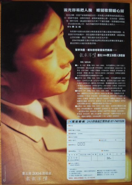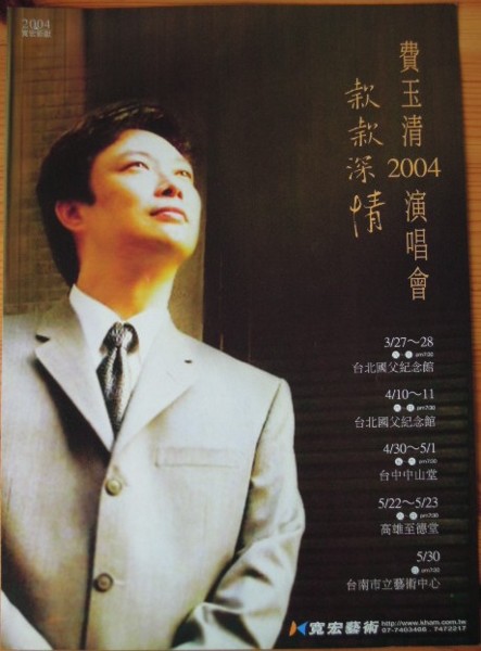 ps. 您的台灣靈異事件...真的很妙....那麼你跟過天眼嗎2004年費玉清聲音很好,現場歌聲不僅脆,仍有厚度,2004年台北最後一場,清唱安可曲,將近20多分鐘,「挑夫」、「為我停留」真不輸早年音質,這情形一直維持至2007年,費玉清聲音明顯變薄,高音讓人提心吊膽,好在2009年恢復了些,2010年也沒讓人失望。