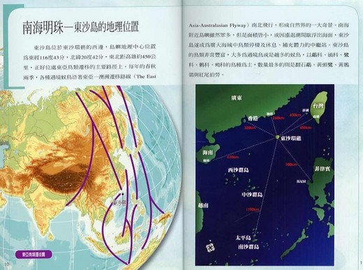 內頁一開始即以一張東亞─澳洲鳥類遷移路線圖和說明東沙的生態地理位置,再以另一張圖呈現東沙與南中國海域各陸地間的距離遠近。從圖上看,東沙位處南中國海北方,正在鳥類的遷移的主要路徑上,因此讓它成為多種鳥類的中繼站,多達70%的鳥類為過境鳥。帶著箭頭的紫紅色遷移遷移路線,北至西伯利亞,南達澳洲西部,讓人驚奇地認知,鳥類體型雖小,但卻擁有廣闊的生存空間,而其生命的靭度也就在這種空間感中浮現出來。另一方面,圖上的箭頭與線條也讓人認識到從東亞島弧到東南亞、新幾內亞及澳洲等這些從人的角度看來隔離甚遠的地域,事實上卻可以藉由鳥類的飛行而連繫起來,而跨越、打破了我們的習見與邊界。這點正合應了詩的功能。