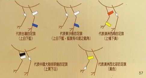 有一隻鴴鳥,右膝上繫著白色足圈,左足上繫白色小旗,下邊繫藍色旗,她是台灣的代表;另一隻鴴,的左足也是上白下藍,但藍旗上截了角,他是地主東沙鳥;還有一隻,白足圈在左足,右足的足旗是上橘下黃,他來自澳洲西南;他的表兄弟住在澳洲西北部,白足圈在右腳下方,黃旗在膝上;而中國崇明島的代表則是左足圈,右足上黑下白是緊鄰著掛的雙旗。牠們都從遠渡重洋而來,打照面後可能就各尋所思、各覓其魚,也可能你前我後相隨細語,或鎮日相安無事;牠們會放屎尿繳稅,但沒人會說髒話或丟蛋蛋或誰要活捉誰。