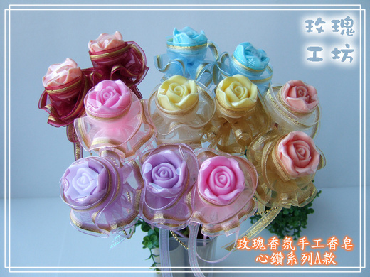 | 現有玫瑰皂顏色:粉紅~水藍~紫~橘~黃 |