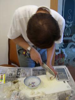 第二道菜就頗為費工夫,油炸的天婦羅,我們一般在日式料理店吃的很精緻、美觀。可是在日本,它是很家常的菜色,不見得以炸蝦為主,像今天川中子先生他選擇用洋蔥、南瓜、地瓜和草蝦,麵衣也簡單的使用中筋麵粉和水成適當的濃稠度。因為,油炸的食物必須趁熱食用才能吃出美味,所以只要一上桌就幾乎不見蹤跡,害我半張照片都沒拍到。最重要的是蘿蔔泥醬汁,是大寶辛苦的磨著大蘿蔔,一點點的累積,所以在這裡記上一筆功勞,以資獎勵。