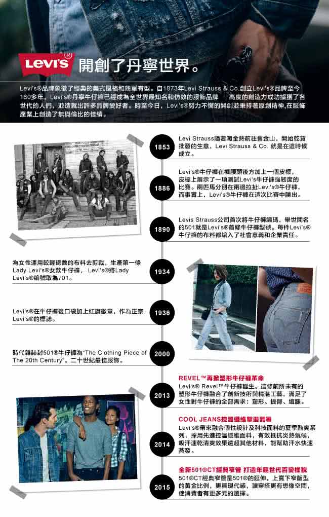 Levi’s品牌象徵了經典的美式風格和簡單有型。自1873年Levi Strauss & Co.創立LEVI’SR品牌至今,Levi’s丹寧褲已經成為全世界最知名和仿效的服飾品牌 – 高度的創造力成功擄獲了各世代的人們,並造就出許多品牌愛好者。時至今日,Levi’s努力不懈的開創並秉持著原創精神,在服飾產業上創造了無與倫比的佳績。我們所引領的丹寧服飾及配件已銷往全球超過110個國家,讓世界各地的人們都可以展現出他們個人風格。