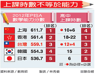 乍看之下,這樣的推論合理。但是,PISA是測驗15歲學生的閱讀、數學、科學與解決問題的能力,和16歲以上的高中課程時數長短有甚麼關係?這算不算「張飛打岳飛」?如果用心點的人去查台灣PISA學生能力國際排名,會發現2006年台灣學生的閱讀能力為第16名,2009年掉到23名,也是因此,國中端學校才開始要求國文科教師加強國文作文與閱讀,並體恤國文教師必須花費額外時間改作文,所以國文老師在授課時數上,比其他科教師少了2堂的原因即在此。如果真的要說2012年PISA學生能力上升,那也是因為國中端加強了閱讀的授課強度,和高中教學一點關連性都沒有。