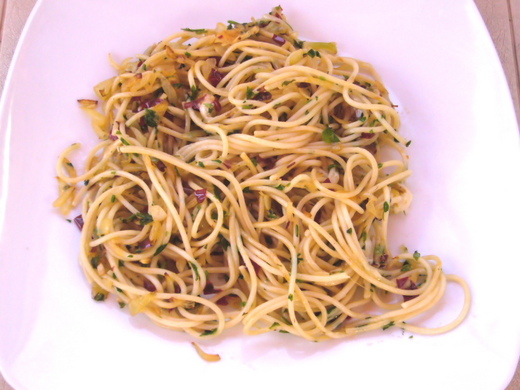 食譜上面的照片,看起來很清爽無負擔,有時懶得大費工夫做菜或是沒時間去買菜準備繁複的食材時,這道紅辣椒義大利麵是不錯的選擇。