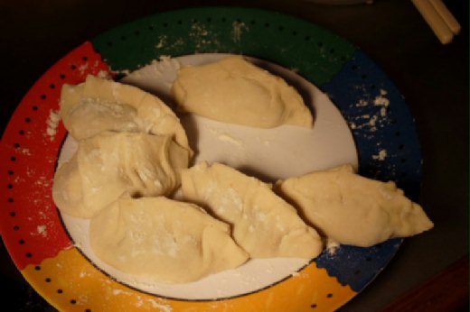 3. 將麵團移到麵板上再加以揉搓至十分光滑時,平均分成20小塊,先搓弄成圓球狀,再用手掌壓扁並用桿麵杖桿成二寸半直徑、中心稍厚的餅皮,將肉餡放進約半大匙在中心部位,然後由手邊折合上半邊麵皮,再用雙手之大拇指與二拇指同時向中間擠合,用力捏緊便可成為一個水餃。註:桿麵皮時,相疊的麵皮之間要灑上足量的麵粉,使麵皮可以保持分離。
