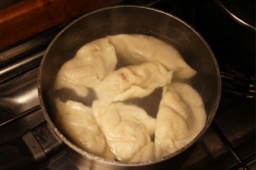 4. 在一只深底鍋中用大火燒滾十杯開水,然後將已包妥之水餃一個個迅速擲入,用湯勺略加轉動一下即蓋上鍋蓋用大火煮至再度沸滾。