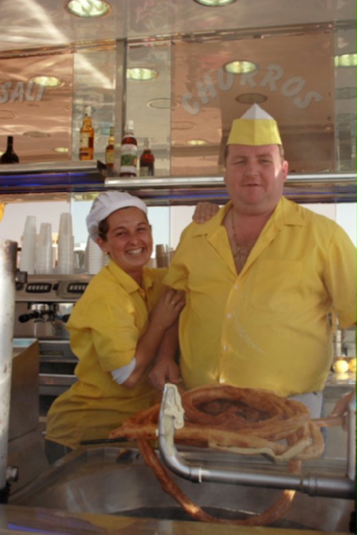 市集裡有三家小吃店,都只供應Churros和一些飲料,我們選擇坐在其中一家名叫Chrisali的店吃點”早午餐”。老闆是英國人,因為喜歡西班牙的天氣和環境,並且娶了西班牙女子,於是在十六年前就在西班牙定居下來。老闆個性豪爽、交友廣闊,待客人向朋友一樣,特別是許多居住在附近的英國人,喜歡每個星期三來這裡聚聚聊聊天。