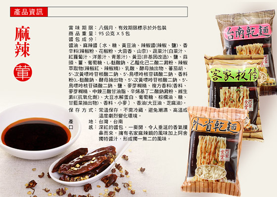 食用方式:乾麵不是泡麵,一定要用滾水煮會熟,所以用泡的是不會熟的!水滾後,麵條放下去,台南乾麵約3分鐘,外省乾麵約4分鐘。煮熟後,將麵撈起,加入調味包即可食用。