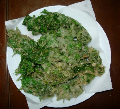 採著嫩嫩的桑葉,心中其實有點忐忑不安,因為不清楚它到底是什麼味道,不過回家查了一下網路,網主在桑葉的烹調法最後加註「味佳」二字,就放心不少,馬上洗淨瀝乾備用,用麵粉調了麵漿,其中還加了胡椒鹽,最嫩的新芽不切,比較大片的嫩葉切絲約一公分寬,然後放入麵漿中拌勻,夾一小撮一小撮下去炸熟就可以了。接著就是忐忑不安的試吃,希望不是很難吃才好,輕輕咬下小小一口,是炸過桑葉的酥脆感,嚼一嚼是炸麵衣的香味,再仔細咀嚼,便開始有非常清淡的清香。YAH!!!嚐試自採野菜食用計劃大成功!^^炸桑葉說不上非常好吃,比起其它野菜(描述寫著「苦澀」)好上太多倍了,下次要挑戰的野菜是「天胡荽」、「鴨兒芹」及「假人參」(後來我查過資料了,確定我看到的那株植物是假人參沒錯。)。
