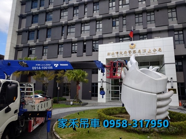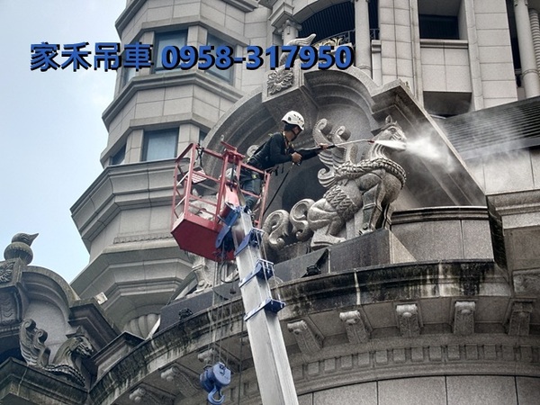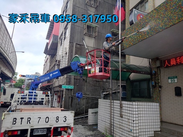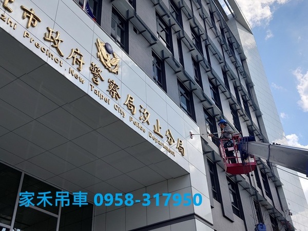 5噸吊卡車出租,新北市汐止分局,吊卡車配合高空吊籃施作外牆清洗。。。