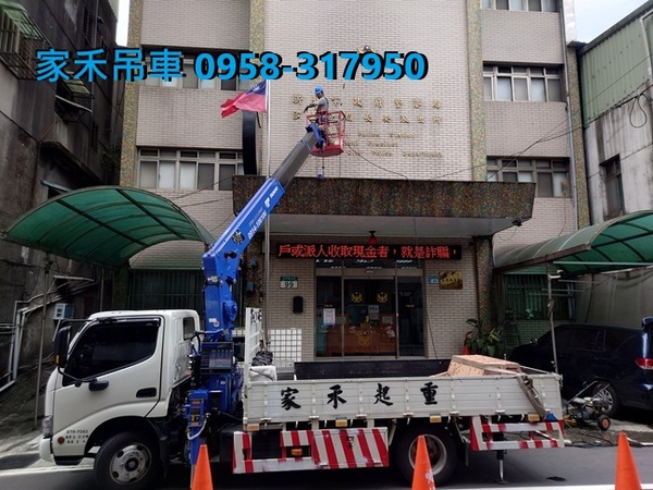5噸吊卡車出租,新北市汐止區長安派出所,吊卡車配合高空吊籃施作外牆清洗。。。
