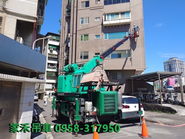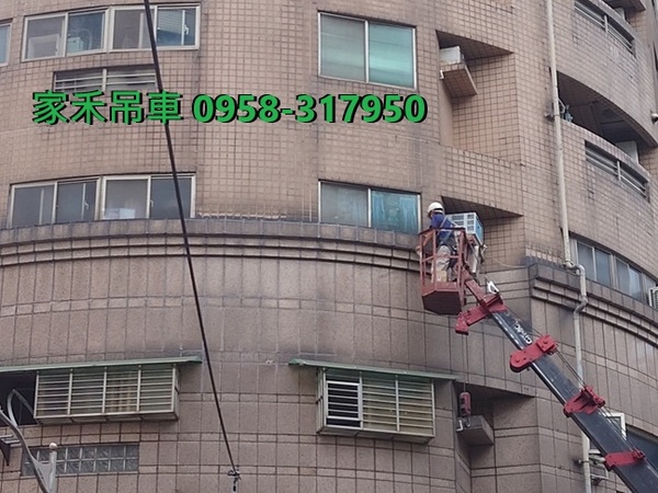 7噸小螃蟹吊車出租,新北市中和區景平路上大樓,吊車配合外牆防水作業矽利康填縫。。。