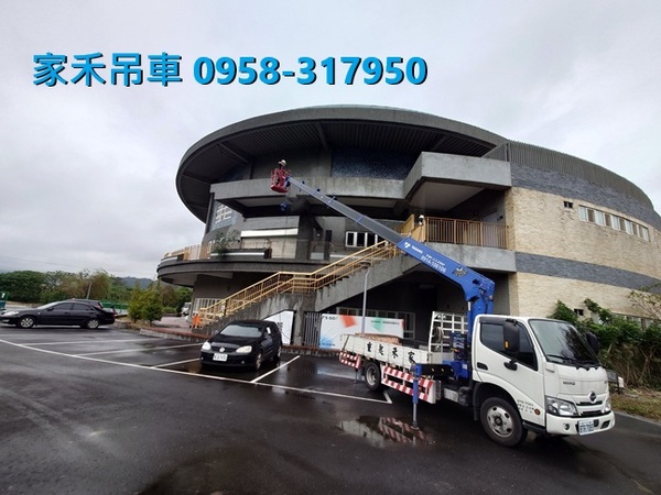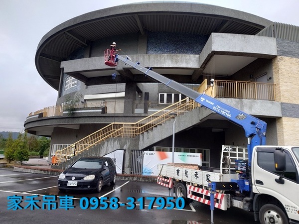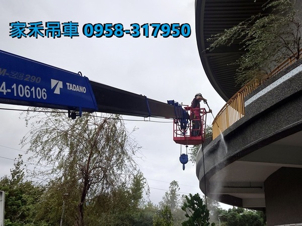 5噸吊卡車出租,新北市鶯歌運動中心,吊卡車配合外牆清洗高空作業。。。