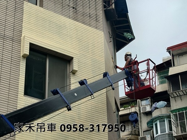 7噸小螃蟹吊車出租,台北市師大路上民宅,吊車配合高空作業外牆防水施工。。
