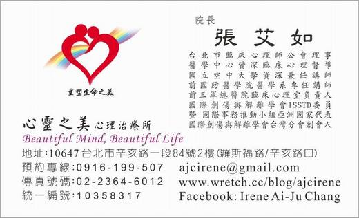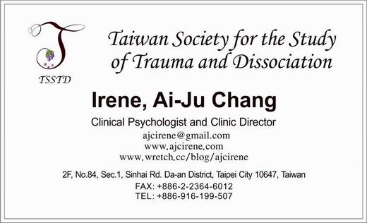上一則: 2011年於 [國際創傷與解離學會ISSTD] 第28屆年會發表海報論文 (DID / MPD /人格分裂/ 人格解離/ 多重人格)下一則: 煩請直接連結另一個完整 [心靈之美心理治療所 暨 國際創傷與解離學會台灣分會 TSSTD] 部落格 05/16/2012