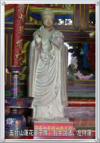 阿彌陀佛的蓮花童子,是真佛宗贈送給「五台山」菩薩頂的禮物,菩薩頂的「達爾吉大喇嘛」,看到漢白玉的「蓮花童子」非常高興,連連恭敬合掌。