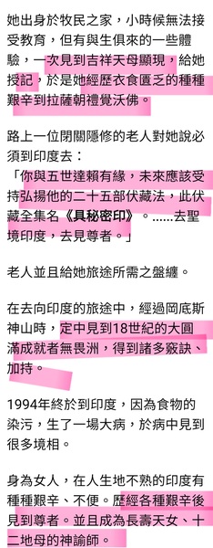 身為女人,在人生地不熟的印度有種種艱辛、不便。歷經各種艱辛後見到尊者。並且成為長壽天女、十二地母的神諭師。