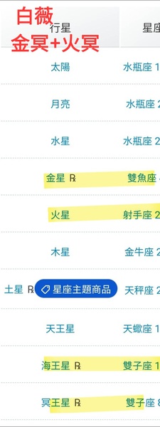 白薇:金星雙魚,火星射手,冥王雙子,金冥90+火冥180,都是負相位。