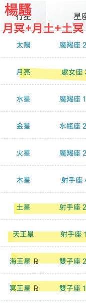 楊騷:月處女,土星射手,冥王雙子,月土90+月冥90+土冥180